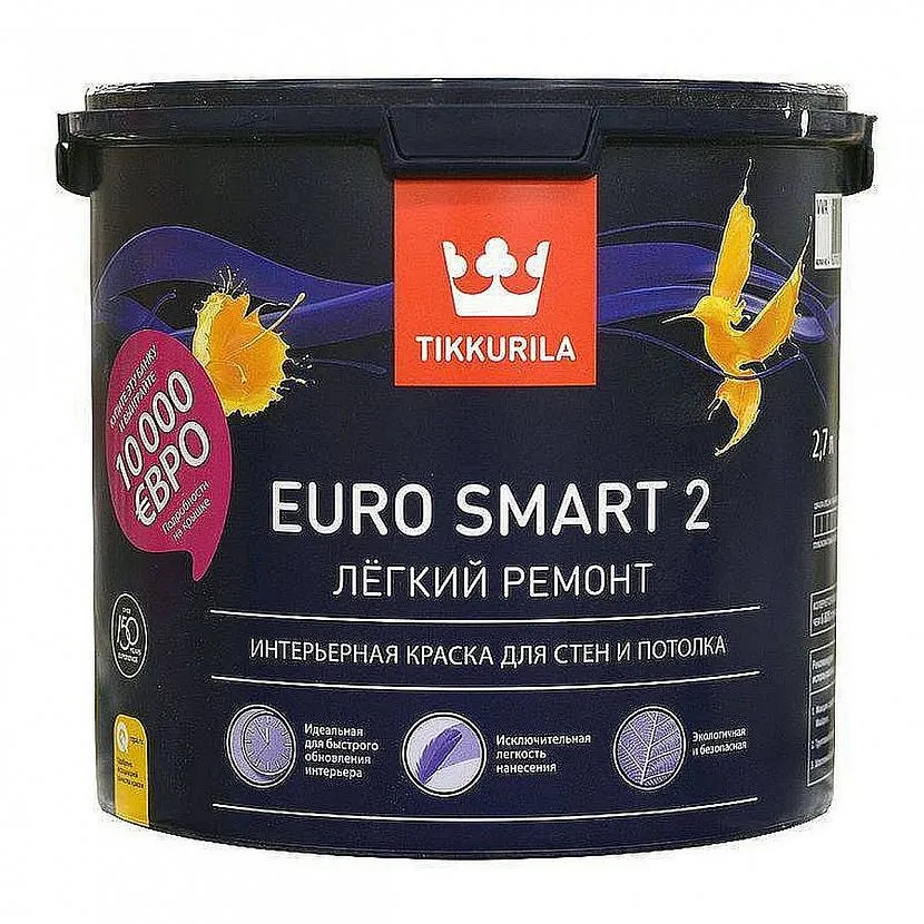 Чтобы получить идеально ровный потолок, достаточно одного слоя краски. После окрашивания Tikkurila сохнет в течение 2 часов. Эмаль не пахнет, поэтому можно использовать в детской и в спальне. Широкая цветовая палитра позволит точно подобрать оттенок под дизайн комнаты. Единственный минус продукции бренда – высокая цена, которая компенсируется износоустойчивостью и простотой эксплуатации.
