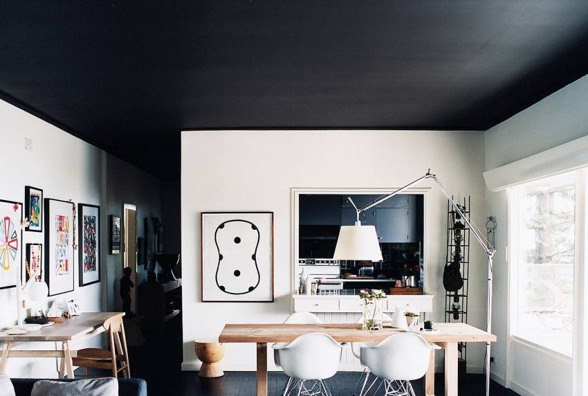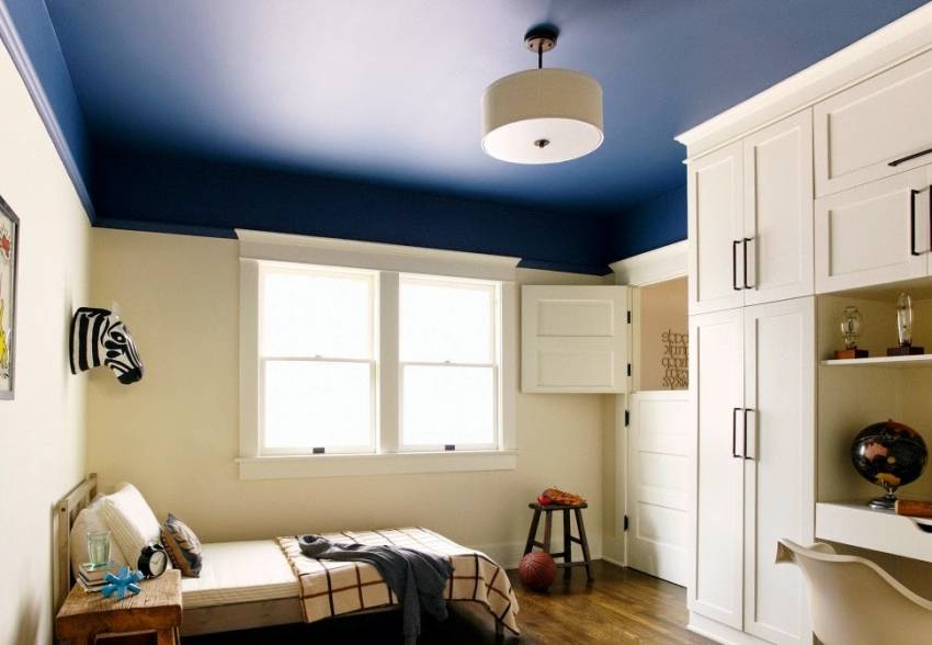 Изюминкой современного интерьера может стать потолок насыщенного цвета, покрашенный матовой водоэмульсионной краской
