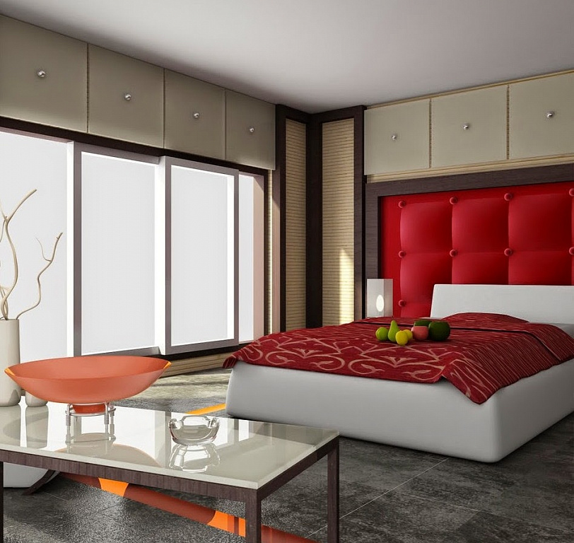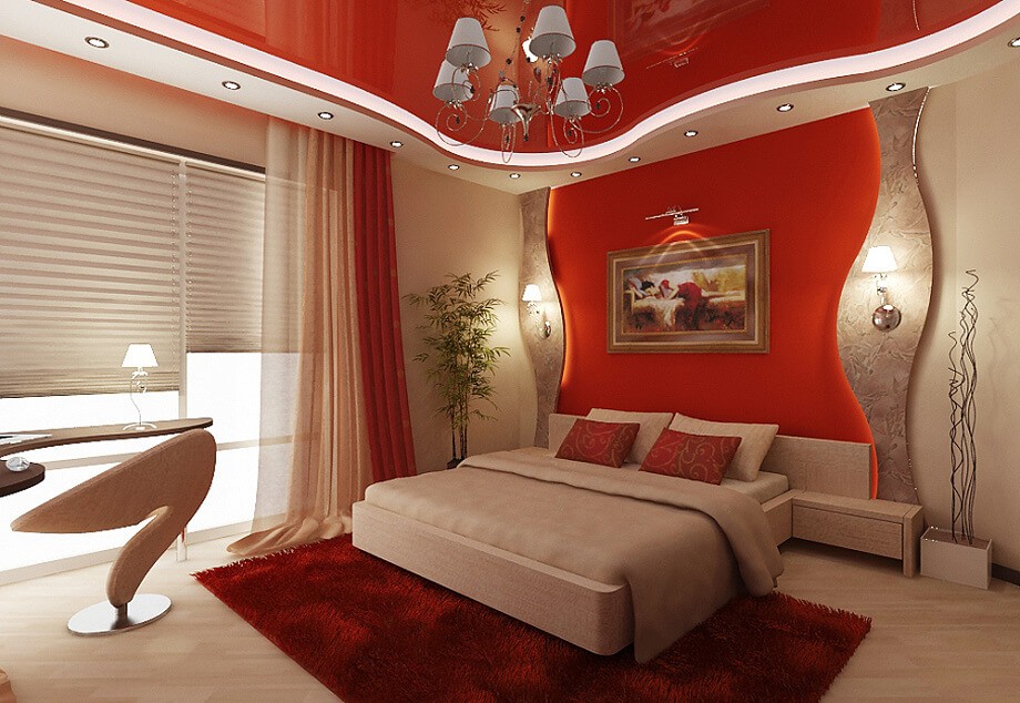 красный цвет создает в интерьере спальни атмосферу чувственности и страсти