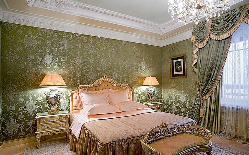 Трендом последних сезонов являются алые обои, дополненные золотистыми узорами. Они смотрятся по-настоящему роскошно, особенно в тех случаях, если к ним подобрать соответствующую мебель.