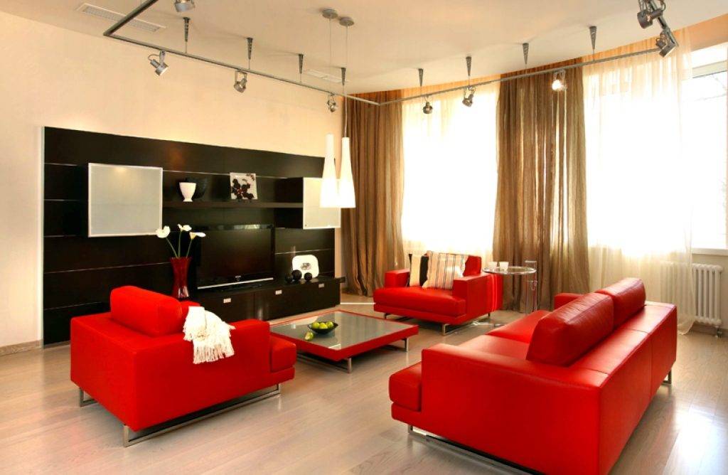 Красные диваны и кресла будут отлично смотреться, украшенные мягкими подушками в цветах оливкового, бежевого, золотисто-желтого, бирюзового, голубого и темно-синего цветов.