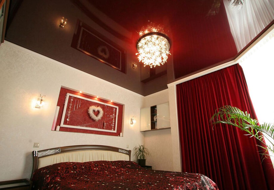 - Натяжные потолки из пленки ПВХ. Это современный материал, который позволяет быстро организовать потолочное пространство. Хорошо смотрятся красные потолки в глянцевом исполнении дополненные подсветкой. Это придаст комнате дополнительную глубину и объем.