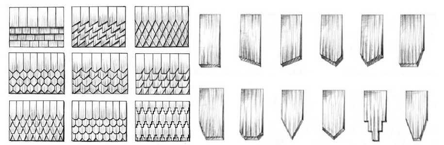 Потом каждая пластинка подстругивается так, чтобы торцы были ровными и дощечки прилегали плотно. Но это еще не все. Теперь остругивается та часть, которая будет лежать под верхними рядами — она делается тоньше. Еще может изменяться наружный край дощечки. С него или снимают фаску примерно под 45° или придают одну из форм.