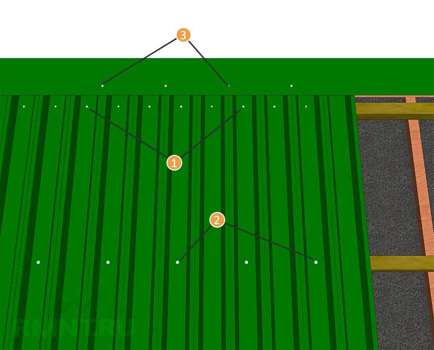 Крепление элементов кровли из профлиста. 1. крайний верхний и нижний ряд по профлисту закрепляется по каждому нижнему гребню к обрешётке. 2. промежуточные ряды креплений распределяются в шахматном порядке через волну. 3. Коньковый профиль крепится самонарезающимися болтами к верхнему гребню волны профлиста.