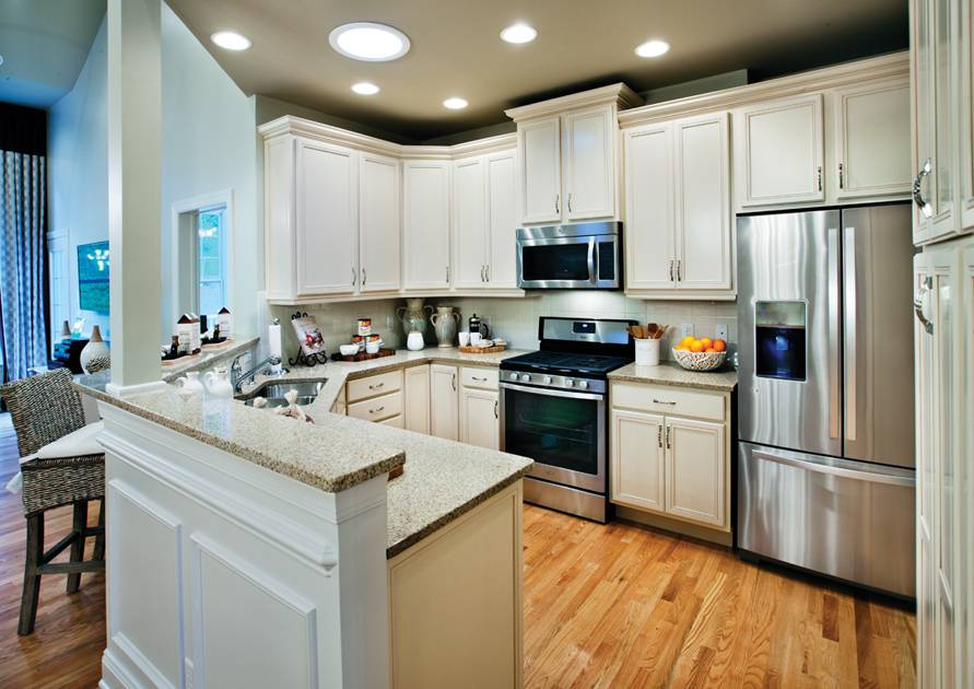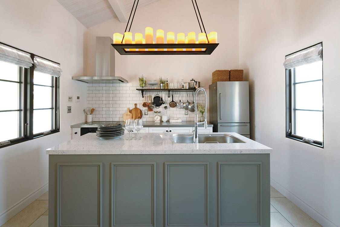 Маленький совет: разместите фигурную люстру непосредственно над кухонным островом. Она станет основным украшением, при этом обеспечивая достаточно света над рабочей поверхностью.