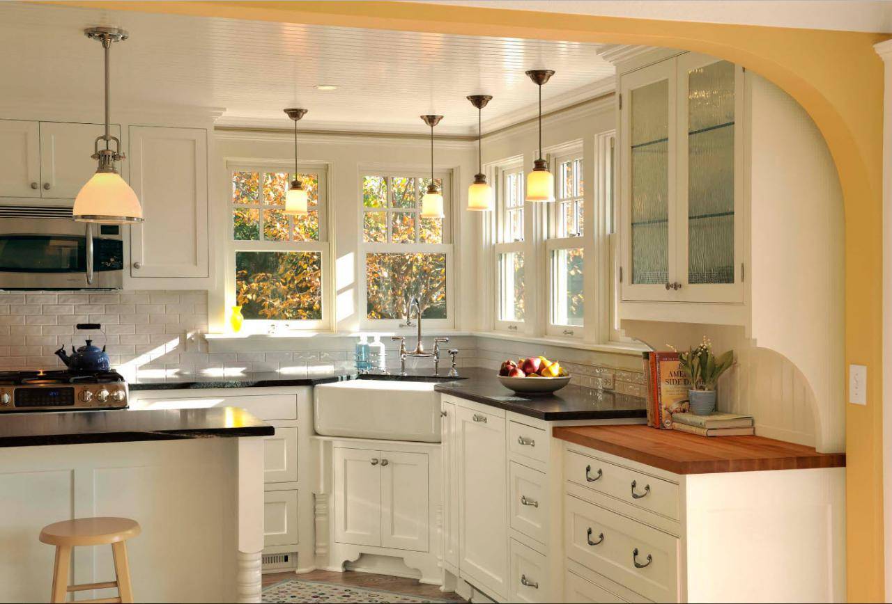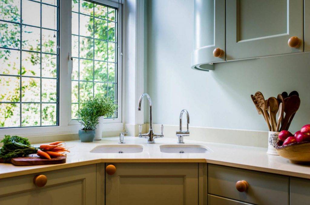 Если окно находится в торце кухни и занимающих соседнюю длинную стену модулей вполне хватает, чтобы разместить всю необходимую утварь, можно ограничиться увеличением подоконника и превращением его в рабочую поверхность. Навесные шкафчики вокруг проёма не требуются. Ничто не помешает оторваться ненадолго от кулинарных процессов и полюбоваться красивым видом за окном, особенно если оно панорамное.