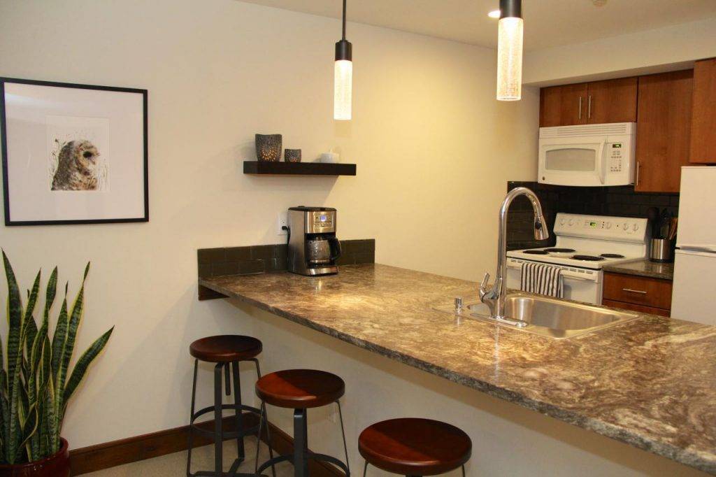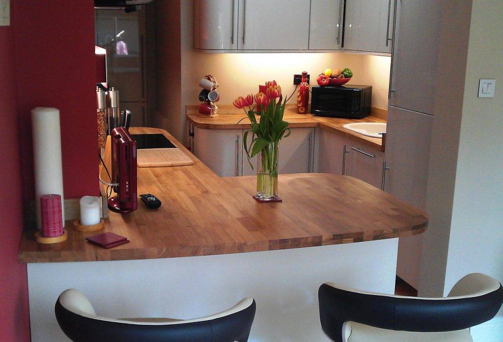 С барной стойкой. Такой гарнитур имеет П-образный вид. Шкафы выстраиваются вдоль стен, или половина может располагаться под окном. Один из торцов совмещают с барной стойкой. Актуальна дополнительная столешница для маленькой кухни, если нет намерения создавать полноценную обеденную зону, отлично заменяет стол. Часто такую планировку можно встретить в квартирах-студиях. Барная стойка здесь может располагаться посередине одной из сторон гарнитура, бывает выдвижной.