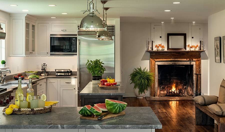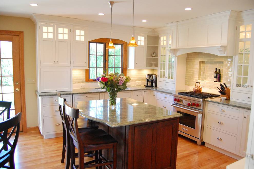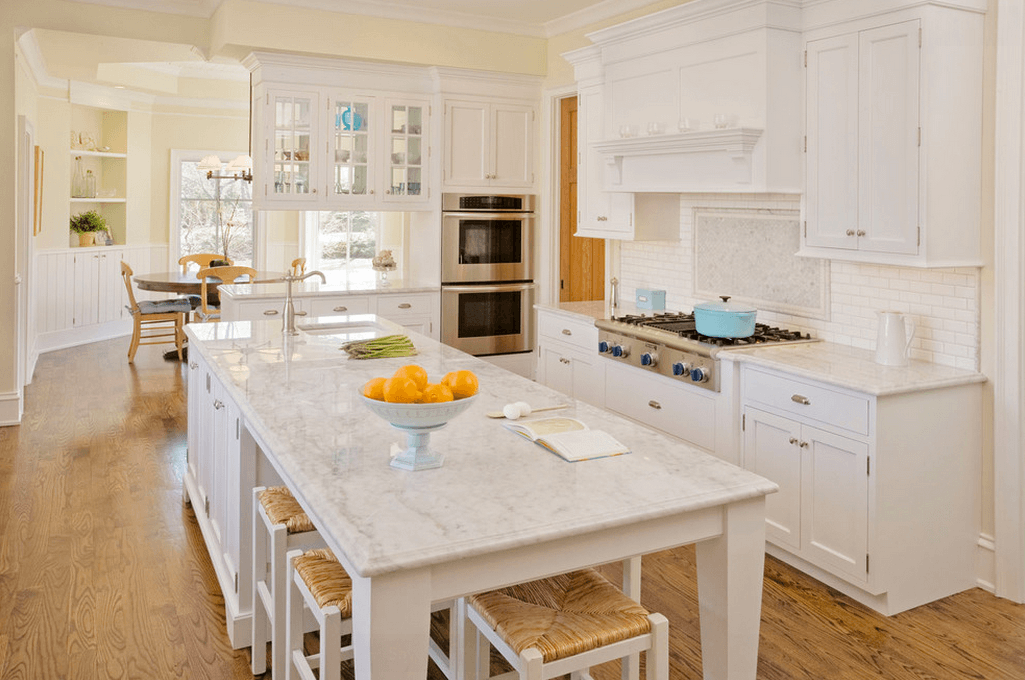 В интерьерах, оформленных в сдержанных традиционных мотивах, остров тоже уместен. Попробуйте сделать кухню в светлых тонах, с белыми фасадами и каменными столешницами. Изящная патина, элегантные детали смотрятся изумительно, особенно в таких масштабах.