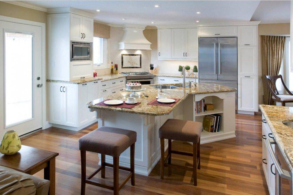 Данная конструкция требует достаточное количество свободной площади, поэтому кухню часто объединяют с гостиной. Особенно удобно использование острова на кухне с габаритами не менее 16-ти квадратов. Для большой кухни 20 кв в квартире в элитной застройке, выбирают объемные модели более 2-х метров в длину.