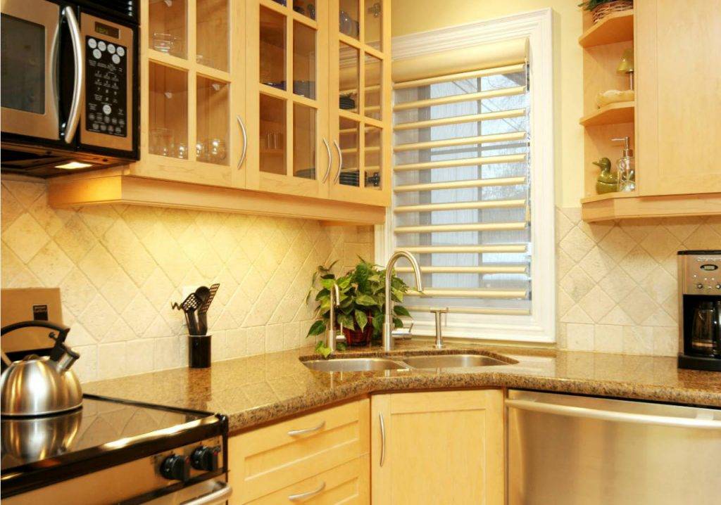 Г-образный гарнитур, установленный вдоль смежных стен. Это стандартный вариант, который встречается наиболее часто в малогабаритных кухнях. Такое расположение оставляет свободным окно, позволяет соблюсти правило рабочего треугольника. На одном из торцов гарнитура, слева или справа, устанавливают холодильник, около смежных стен варочную панель и мойку. В этом случае между «вершинами» треугольника остается допустимое расстояния – около 1,5 метров. Это удобно.