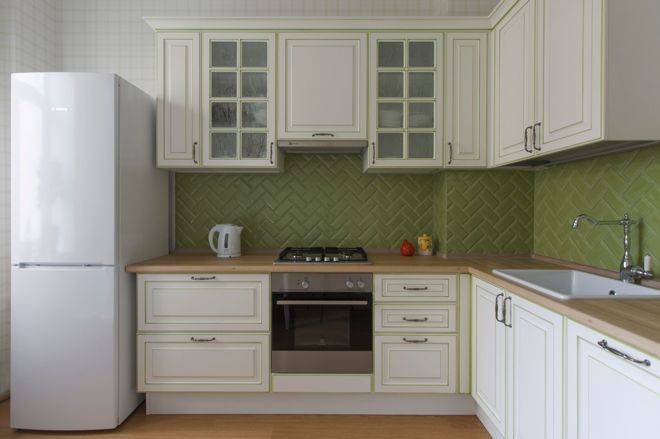 Это позволит закрыть часть короба нижними и верхними шкафами. Оставшееся пространство оформляется керамическим рабочим фартуком или другим отделочным материалом.