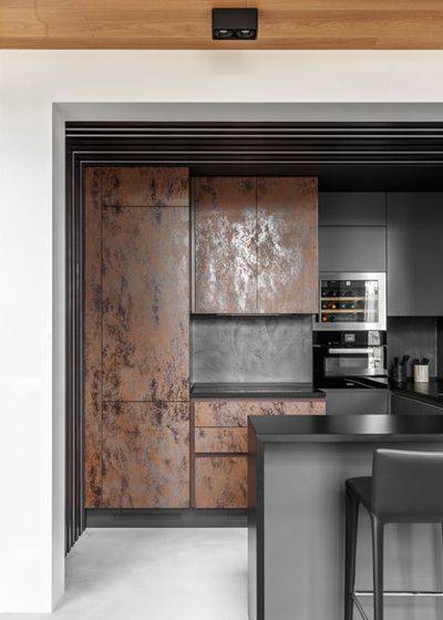 Декор вентиляционного короба на кухне: скрыть или показатьЗависит от планировки кухни и размеров короба. Если выступ расположен сбоку и отделен от рабочей поверхности колонной (как на фото проекта от студии New Wave Interior), проще всего оформить его в цвет стены.