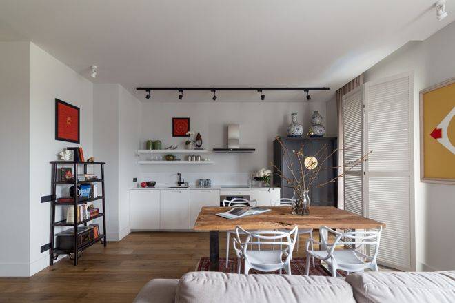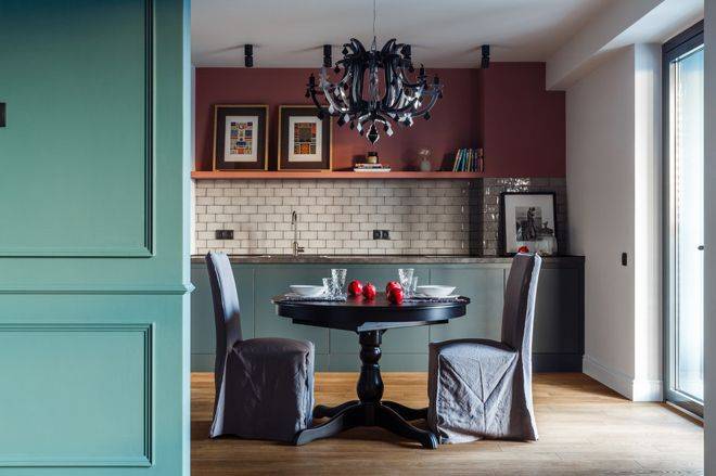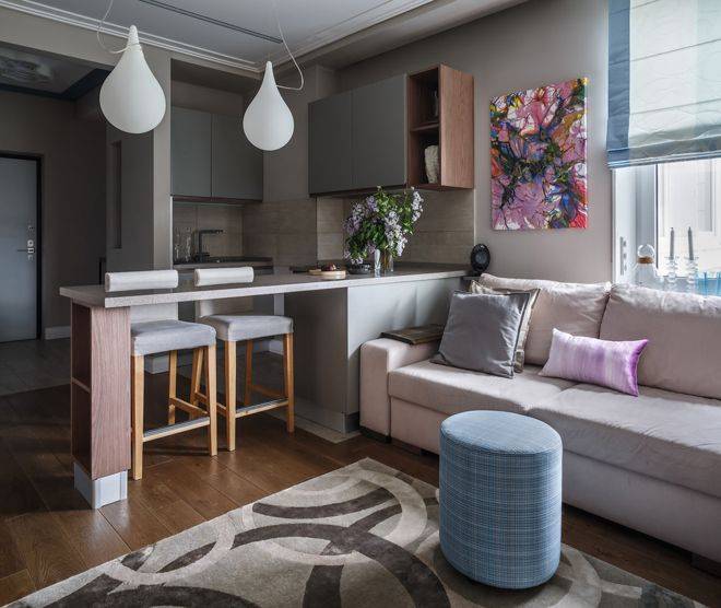 - Как вариант, условная колонна вентканала может стать отправной точкой барной стойки или небольшого обеденного столика.