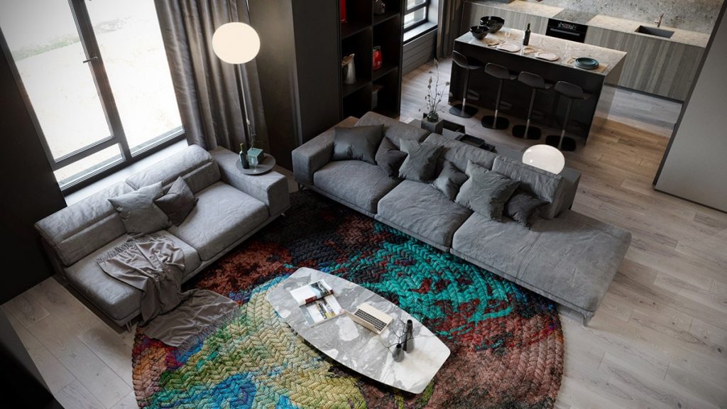 Отделяют зоны мебелью. На границе двух комнат можно установить диван, барную стойку, обеденный стол.