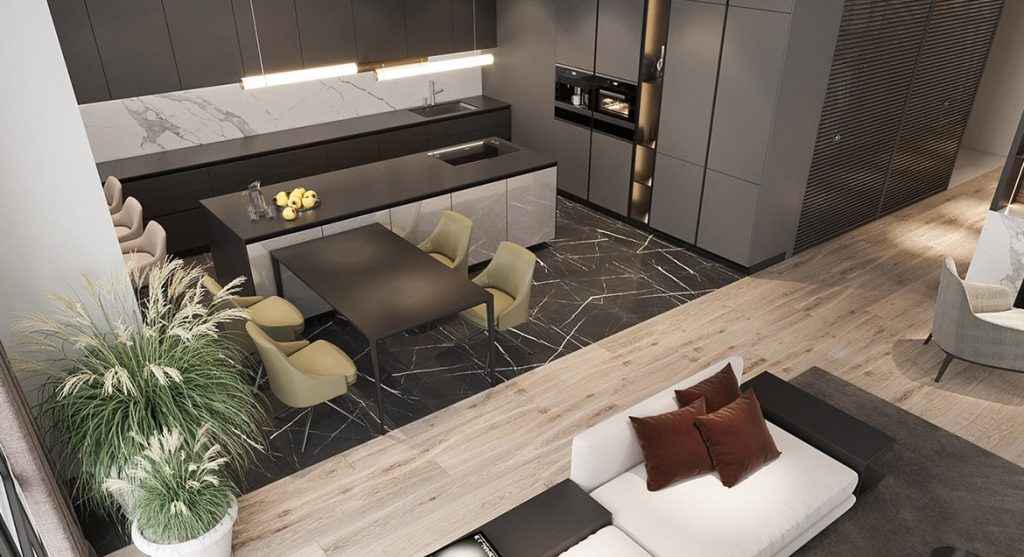 - разделение кухни и гостиной достигается при помощи зонирования различными способами.