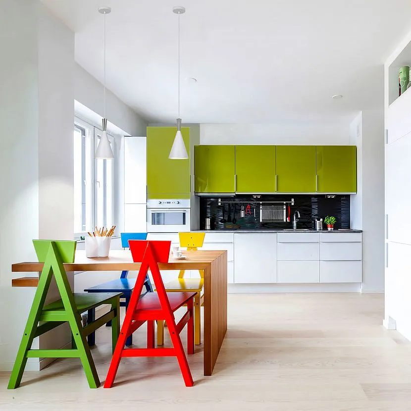 К примеру, отлично будет выглядеть сочетание белого гарнитура и красного фартука. Красными могут быть некоторые предметы мебели и бытовой техники — стулья, холодильник, микроволновая печь и т. д.