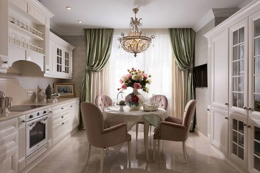 Помещение должно быть достаточно просторным и светлым. Подчеркнуть классический стиль поможет позолота и резные элементы на деревянной мебели. От пластика в отделке придется отказаться.