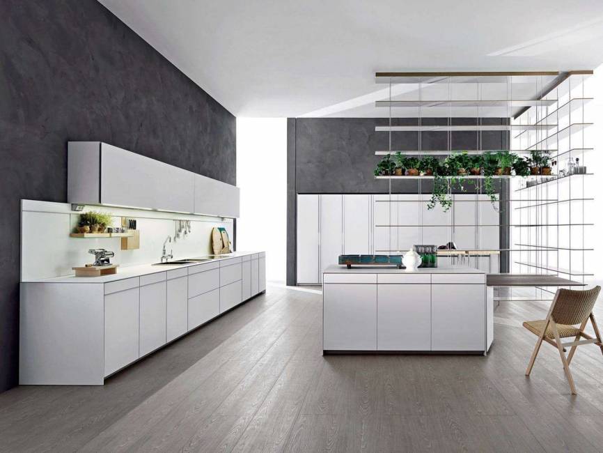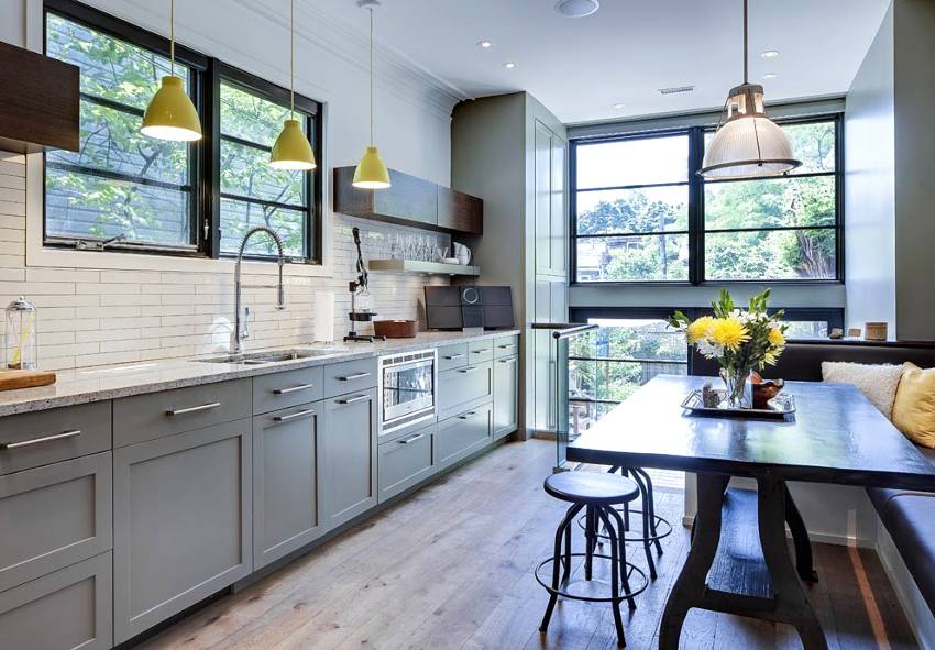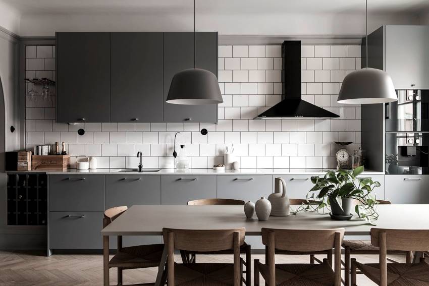 Этот цвет не должен доминировать, его задача дополнять и подчеркивать серый базовый тон. Темная мебель, отделка на шкафах, аксессуары в виде цветочных горшков и черных деревянных рамок, темный фартук, имитирующий доску для мела, станут отличным вариантом. Избежать мрачного эффекта поможет обилие света, белые стены, светлый пол.