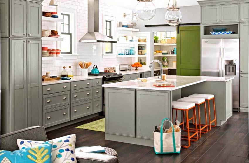 Ведь дизайн серой кухни надоест вам не скоро, а яркая зеленая или синяя кухня наскучат гораздо быстрее.