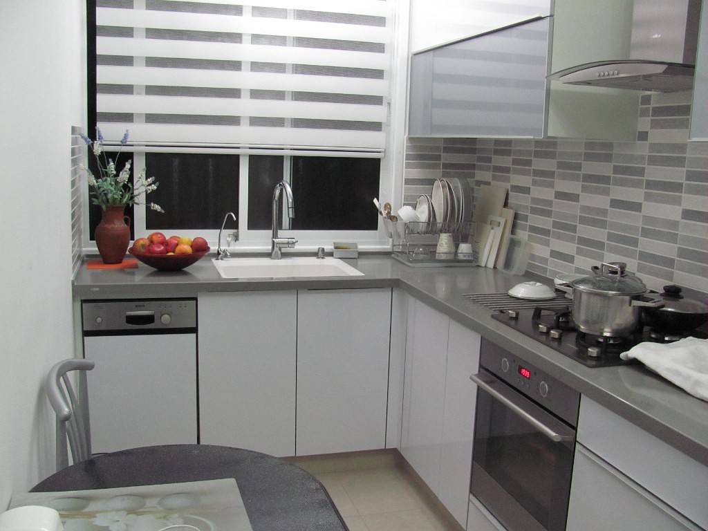 Светлые оттенки серого выгодно смотрятся в интерьере небольшой кухни, размер которой визуально расширяется