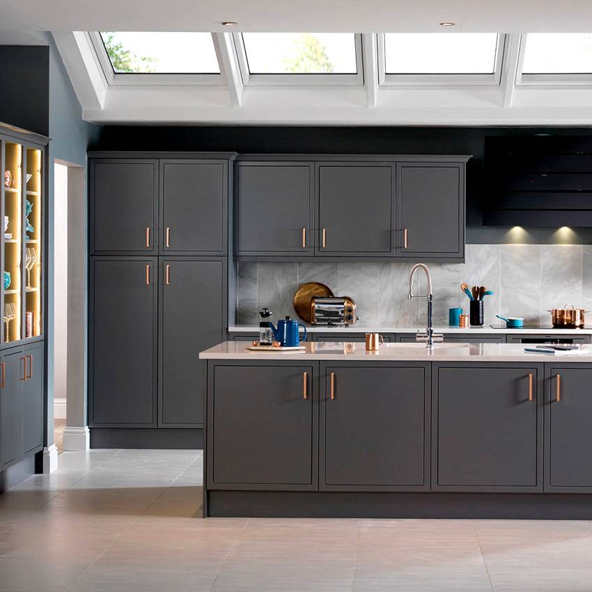 Темно-серые мебельные фасады стоит оставить для больших комнат. Если же очень хочется использовать именно насыщенные оттенки цвета, несмотря на советы дизайнеров, то при установке кухонного гарнитура лучше отказаться от верхнего ряда шкафов, оставив только нижний.