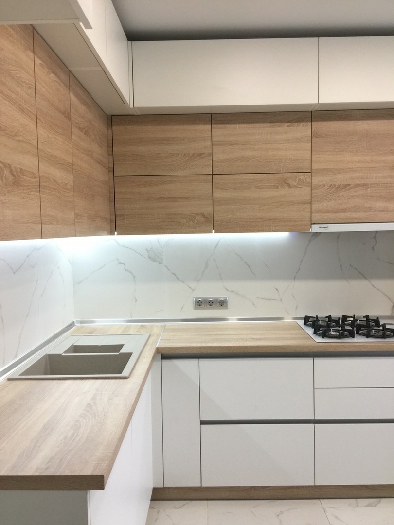 - Цвет фасадов. Наиболее популярный – белый. Также часто используются фасады под светлое дерево, в медово-золотистых и коньячных оттенках. Допускается контрастная столешница (как правило, из массива дерева).