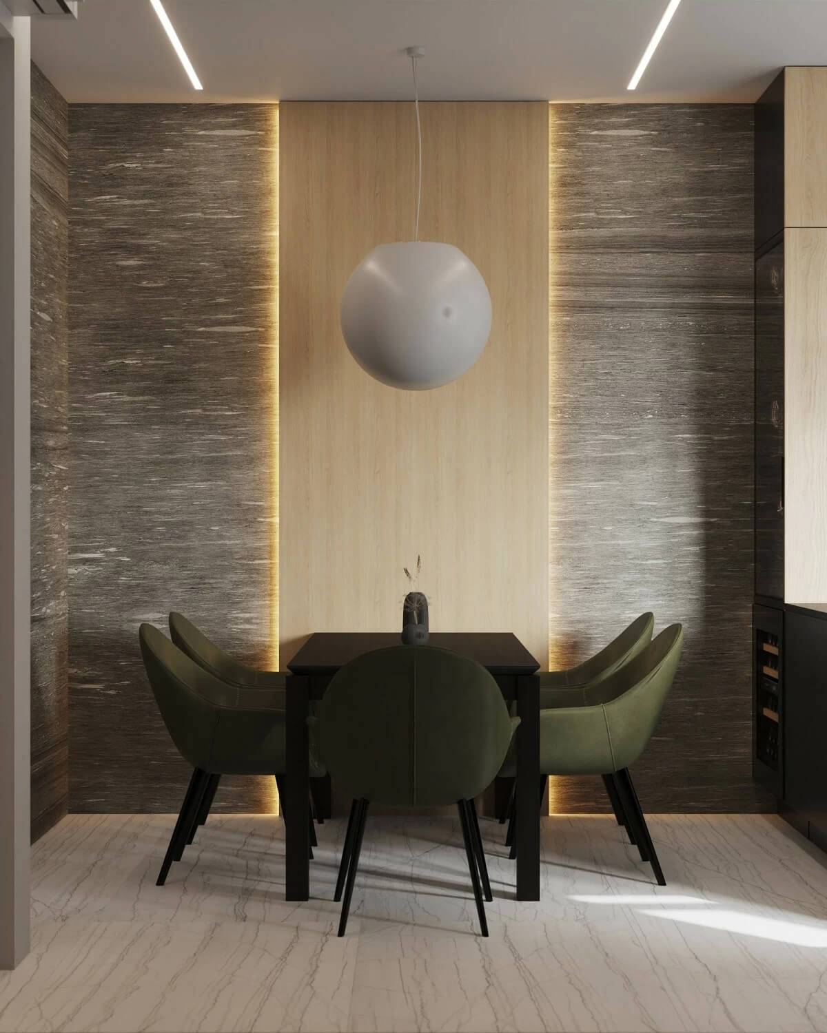 Подсветка стеновой панели в зоне столовой. Проект трёхкомнатной квартиры в минимализме (Волгодонск), дизайнер Артём Алексеев