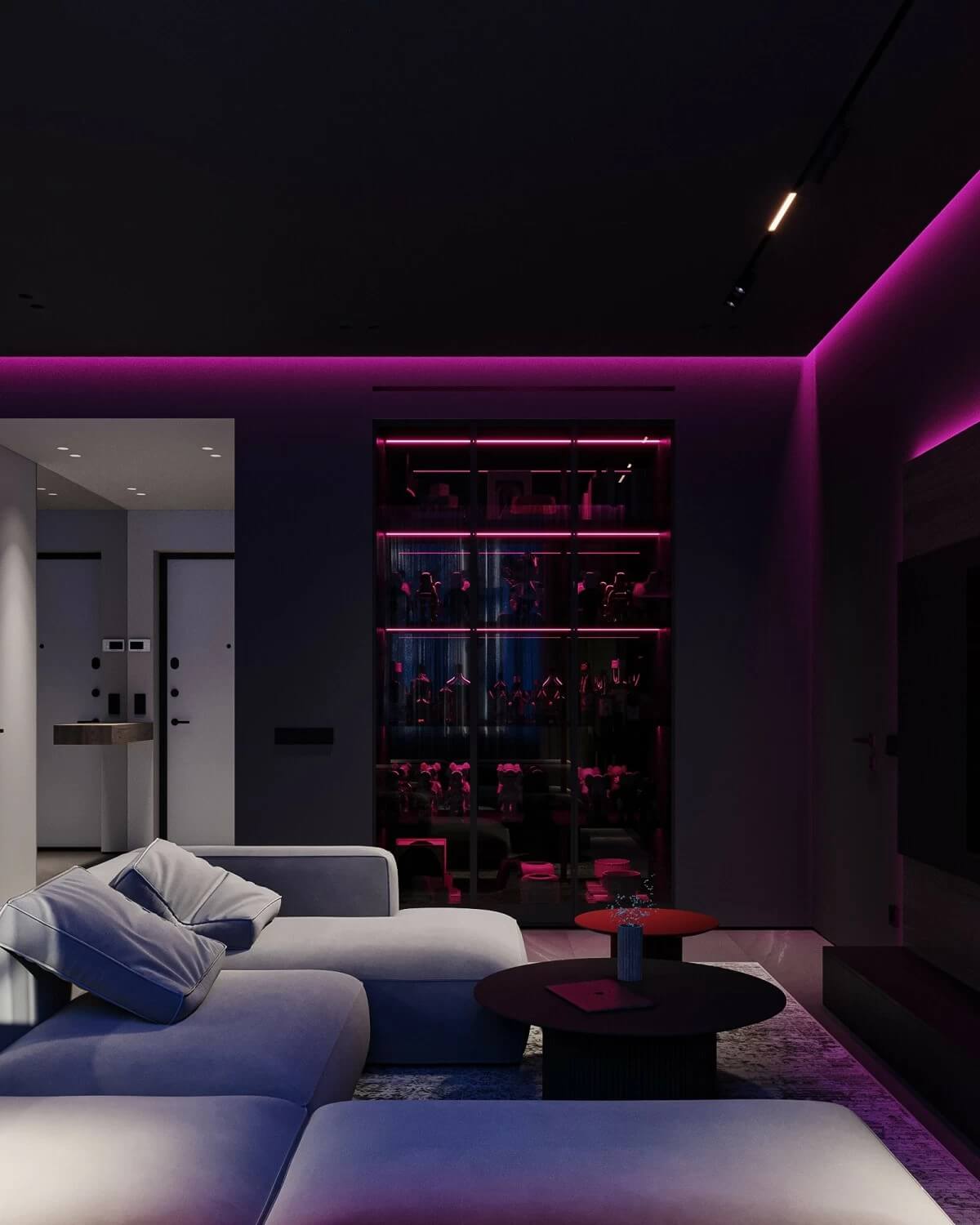 Можно предусмотреть несколько сценариев подсветки винного шкафа и менять режимы под настроение. Проект квартиры в ЖК “Royal Park”, дизайнер Артём Алексеев