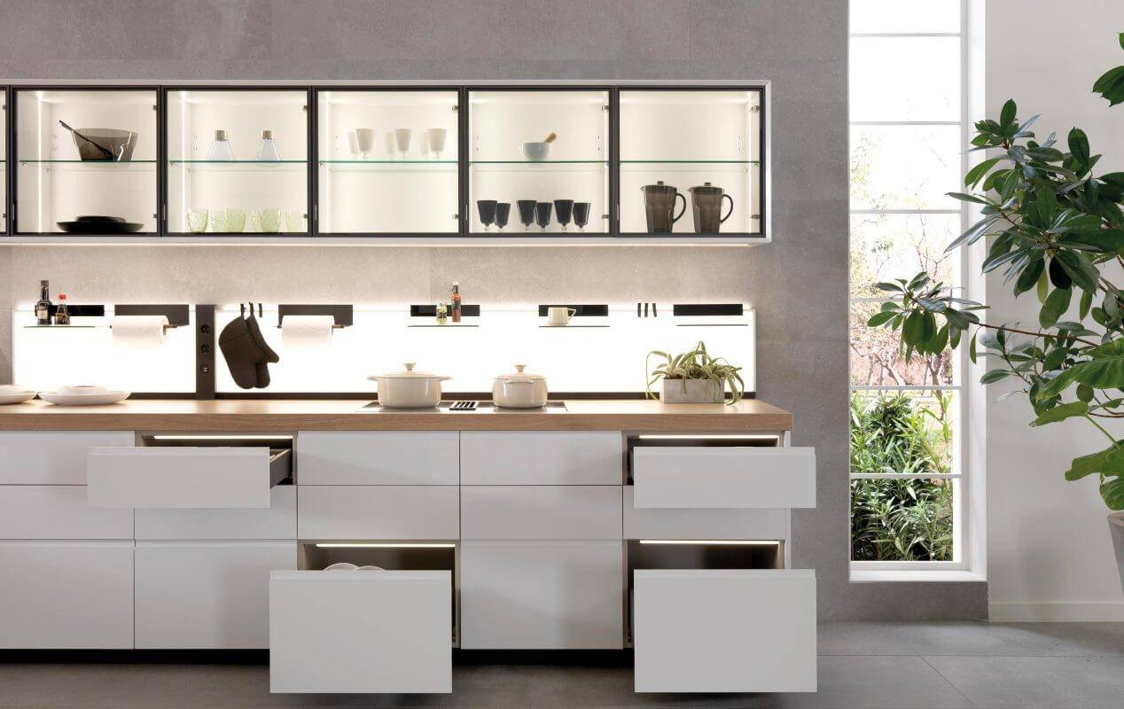 Подсветка внутри кухонных шкафов помогает найти нужную вещь без включения основного света. Кухня GamaDecor