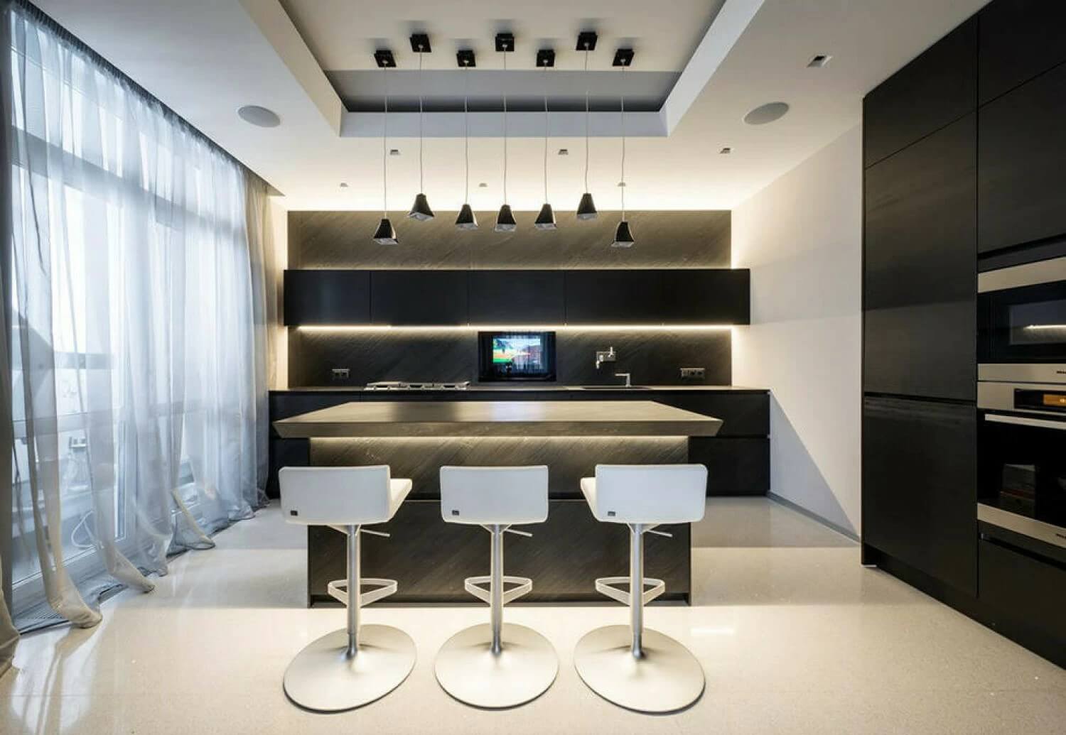 Подсветка различных кухонных зон, в том числе под столешницей. Интерьер квартиры “Dominion”, дизайн Элен и Майкла Мирошкиных