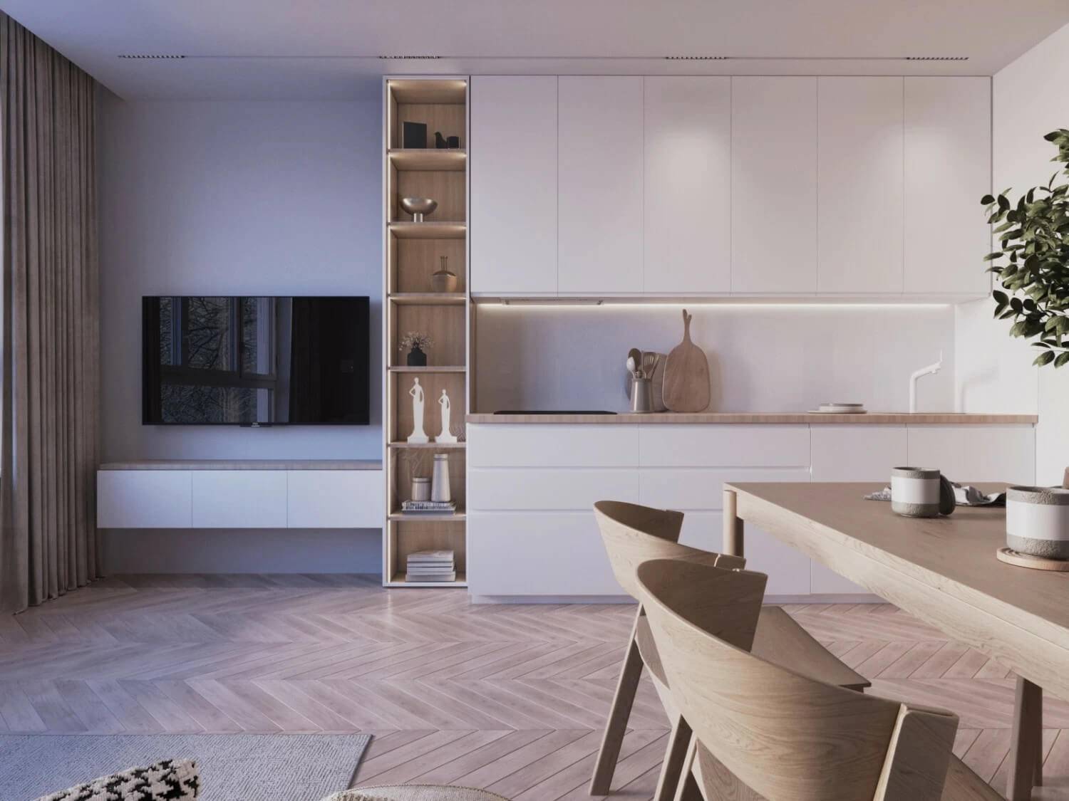 Длинная столешница как объединяющий элемент двух пространств — кухни и гостиной. Проект квартиры «Н2470», дизайнер Юлия Вышнепольская