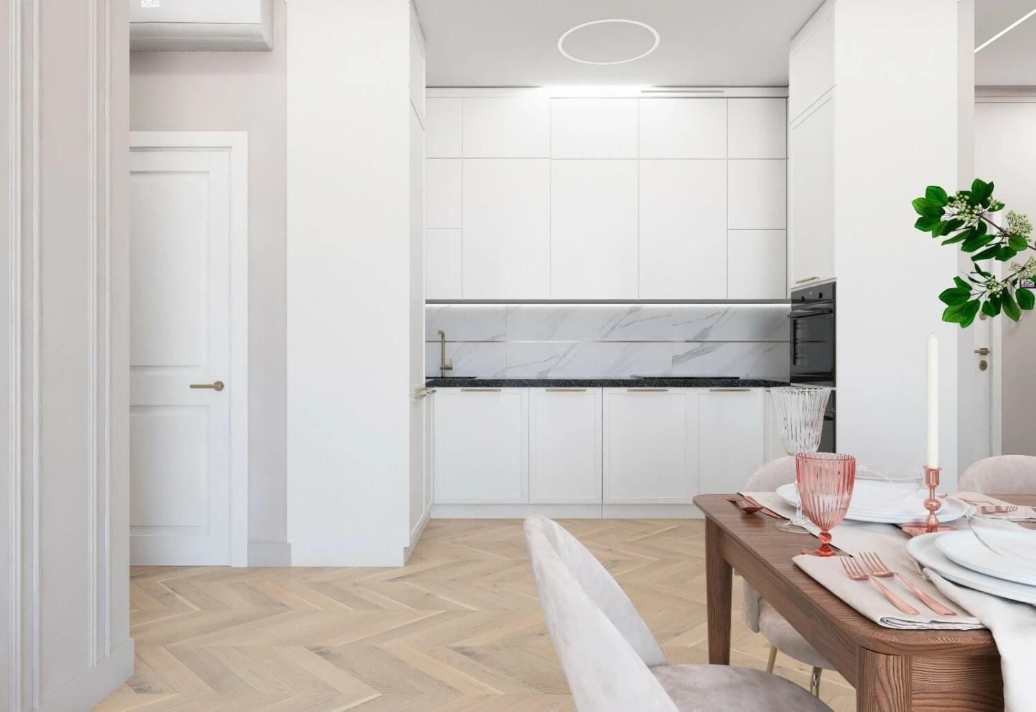 Подсветка рабочей зоны — распространённое практичное решение. Проект квартиры в неоклассике, дизайнер Светлана Шалыго