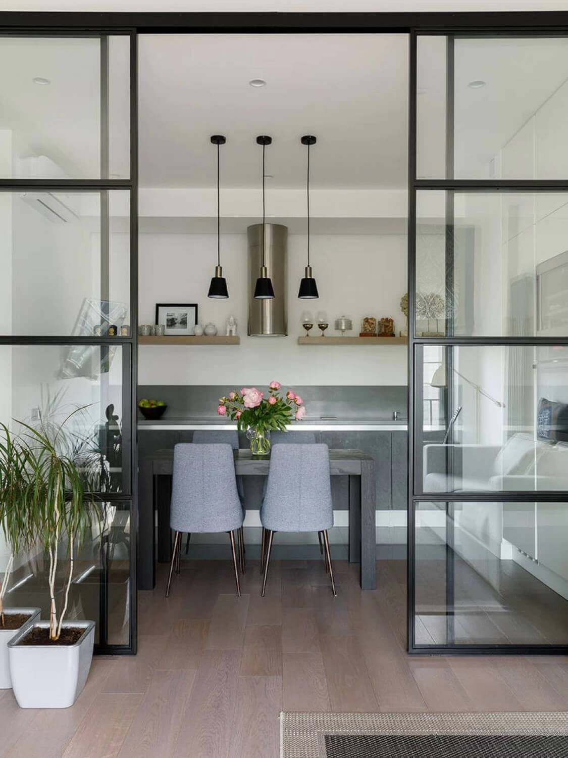 Кухню от гостиной можно отделить с помощью стеклянных раздвижных перегородок. Авторская квартира дизайнера: «от себя» и «для себя», дизайнер Александра Шулепова