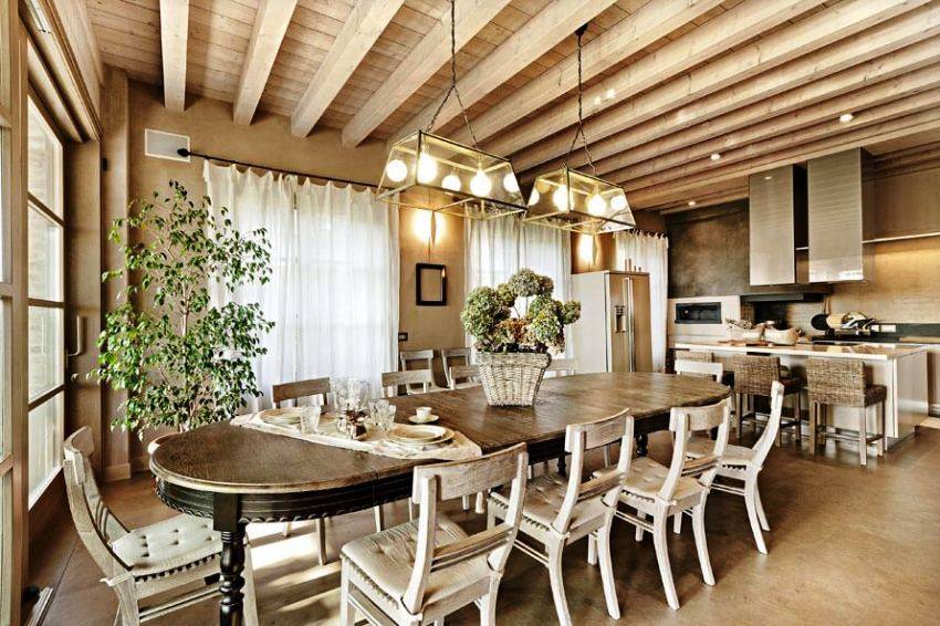 Это направление идеально подходит для загородного жилища. Просторное помещение позволяет грамотно расположить мебель, организовать комфортную обеденную зону. В рабочую часть кухни легко впишется островной стол, увеличив поверхность для готовки.