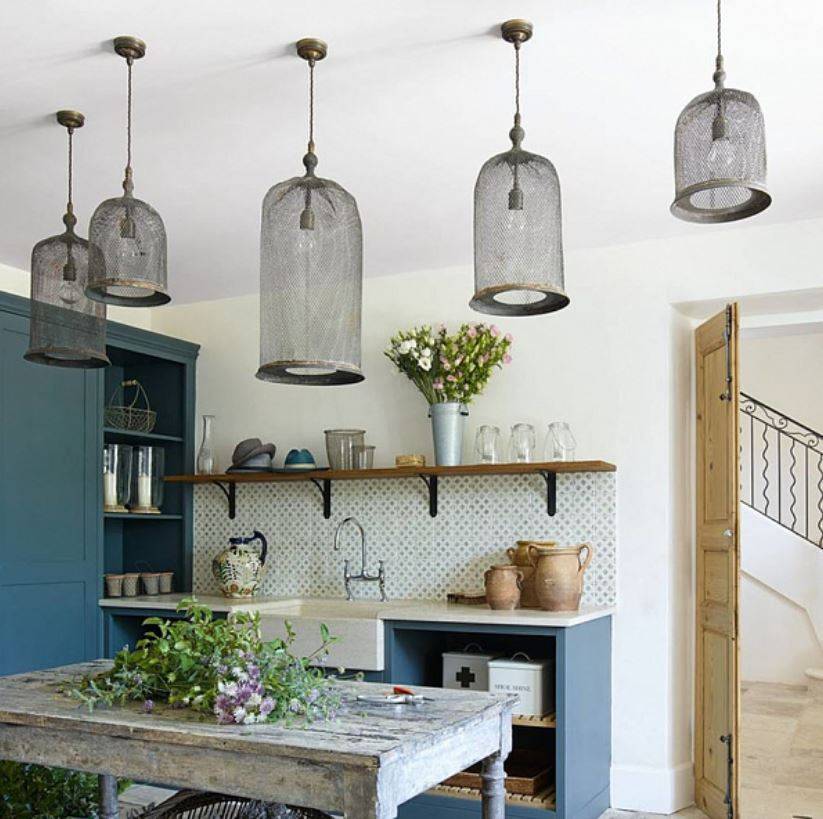 Искусственное освещение на прованской кухне должно быть равномерным и мягким. Чтобы этого добиться, вместо одной мощной люстры используйте множество небольших приборов (можно в дополнение к основной люстре). Например, это могут быть точечные светильники, настенные бра или просто расставленные по комнате настольные лампы и торшеры.