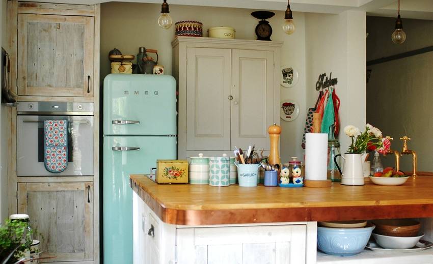 Технику стоит выбрать в стиле ретро, либо спрятать за фасадами