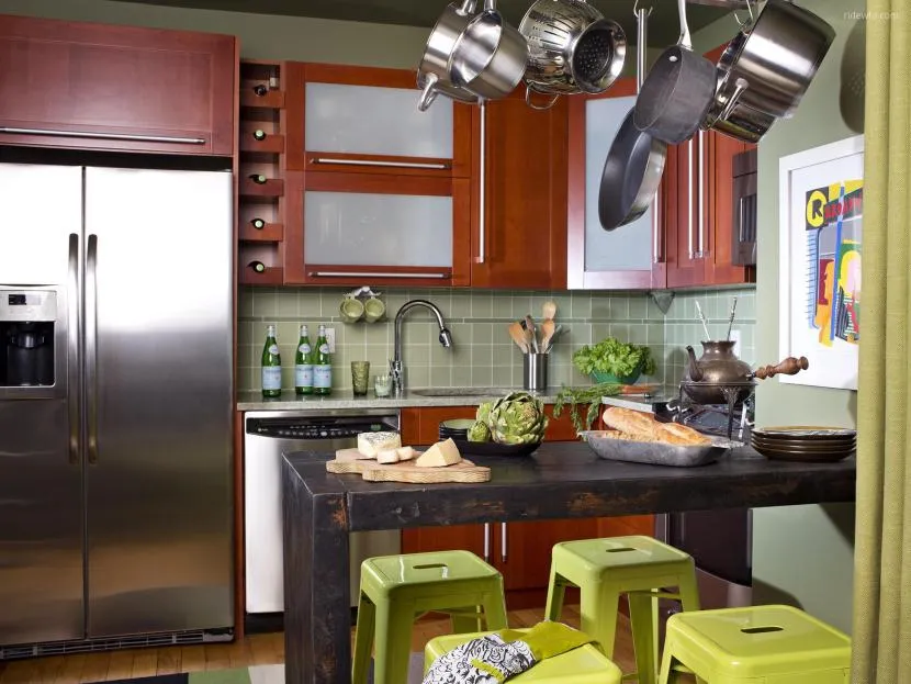Современную небольшую кухню можно выдержать и в темных вишнево-черных оттенках, но, как правило, гарнитуры для миниатюрных помещений – светлые и яркие. Чем больше света в помещении, тем просторнее оно выглядит. А жизнерадостные оттенки, вроде желтого, красного, оранжевого и салатового пробуждают аппетит. Цвет стен и потолка обязательно должны быть светлыми, исключение можно сделать только для пола. Все остальное также работает на расширение пространства: