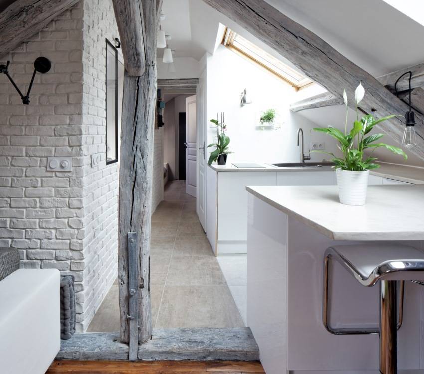 интерьере маленькой квартиры, расположенной на мансарде высокого дома с красивой архитектурой и необычной планировкой. Вам, непременно, понравится этот дизайнерский проект!