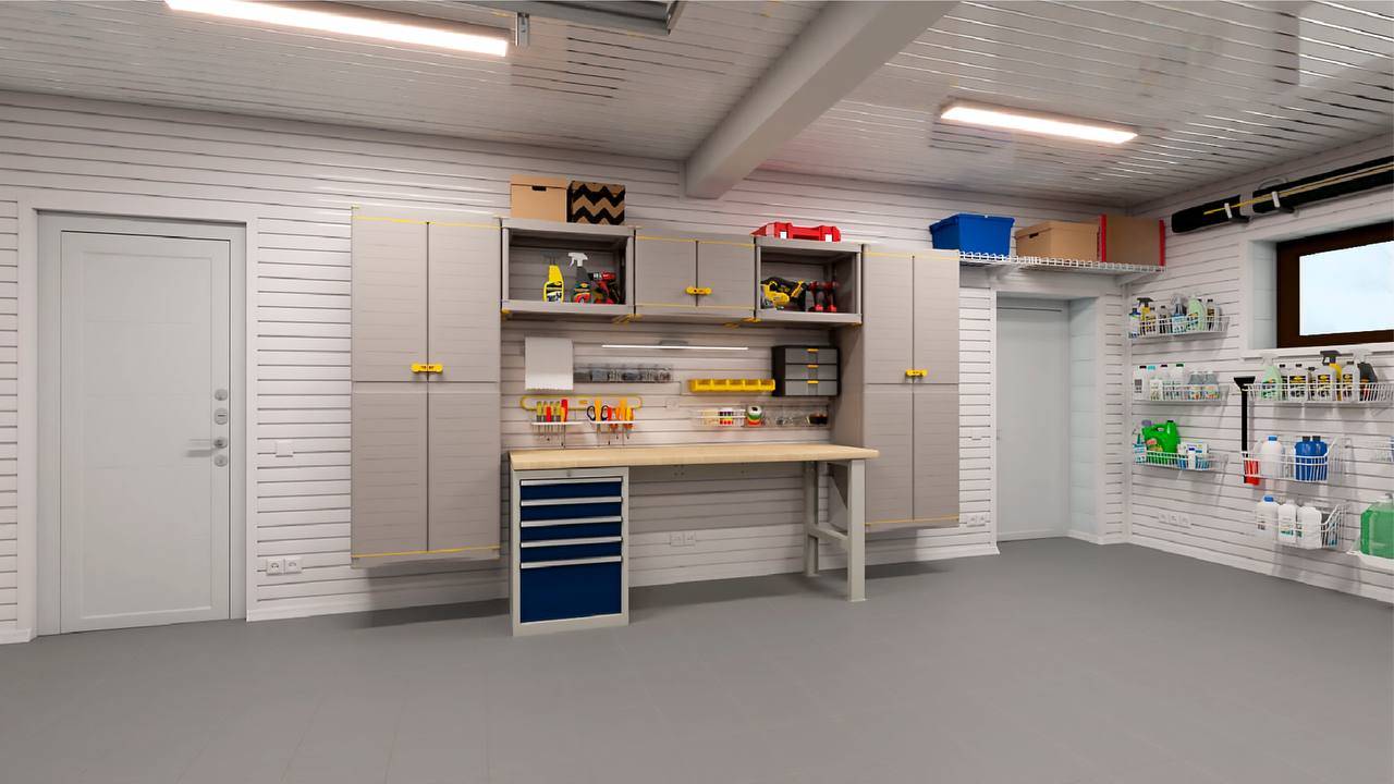 Первое, что приходит на ум для внутренней организации, — создать удобную зону мастерской. Самый популярный вариант обустройства — вынос мебели, приспособлений и инструментов в заднюю зону помещения, к стене, находящейся напротив ворот. Здесь может хватить места даже для расположения какого-либо другого необходимого оборудования, помимо верстака.