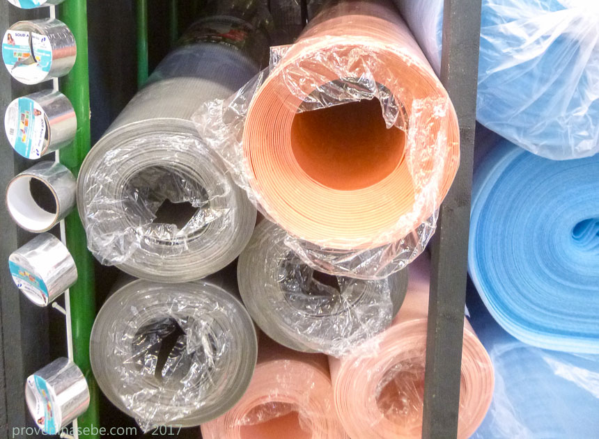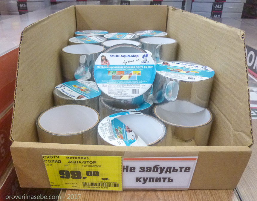 Еще потребуется скотч чтобы склеивать подложку. Можно использовать специальный, металлизированный, который предотвращает проникновение воды между листами подложки и, якобы, обладает термоизоляционными свойствами. Но вполне подойдет обычный или даже малярный скотч. Они дешевле, а результат получается почти такой же.