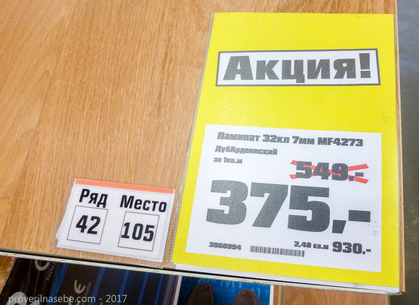 Но самое пристальное внимание стоит обратить на те виды ламината, которые продаются со скидкой по акции. Их обычная цена указывает на то, что это не самый худший представитель в своем классе, а скидка до 30-50% делает покупку гораздо приятнее: