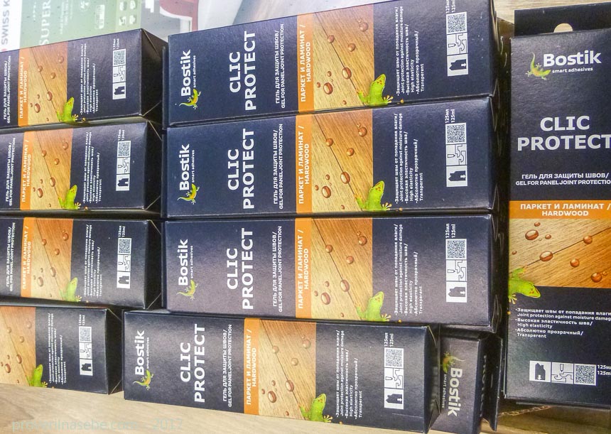 Обратите внимание на специальный гель для затирки щелей между дощечками. Особенно он уместен там, где имеется риск попадания на покрытие воды