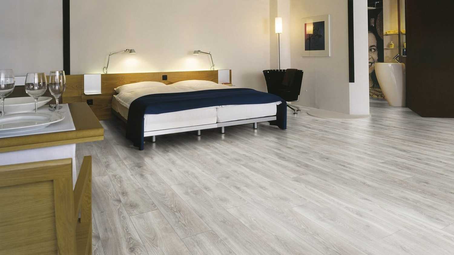 - Белый или очень светлый пол. Для такого ламината лучше выбрать обои на три тона темнее — так пол и стены не будут сливаться, а интерьер не будет похож на больничную палату.