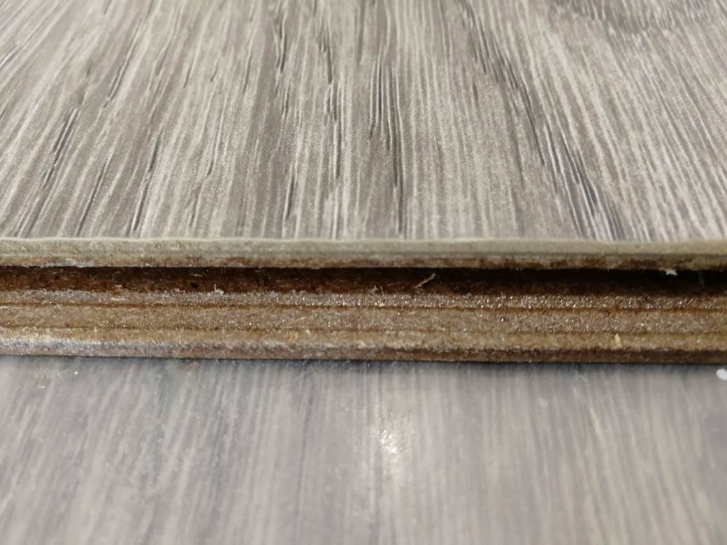 - Третий слой является основой полотна ламината. Это волокнистая древесная плита. Именно этот слой обеспечивает показатели прочности всего покрытия. Материал для изготовления этого слоя производитель закупает в Европе, что гарантирует высокое качество.