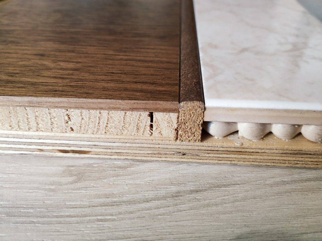 В первом случае в месте перехода плитки в ламинат приклеивается полоска из пробки. Ламинированная панель в месте соединения обязательно пропитывается составом, защищающим от воздействия влаги. Пробковый материал относится к категории экологически чистых. Имеет продолжительный срок службы. Это делает возможным его использование при оформлении любого помещения, включая кухню.