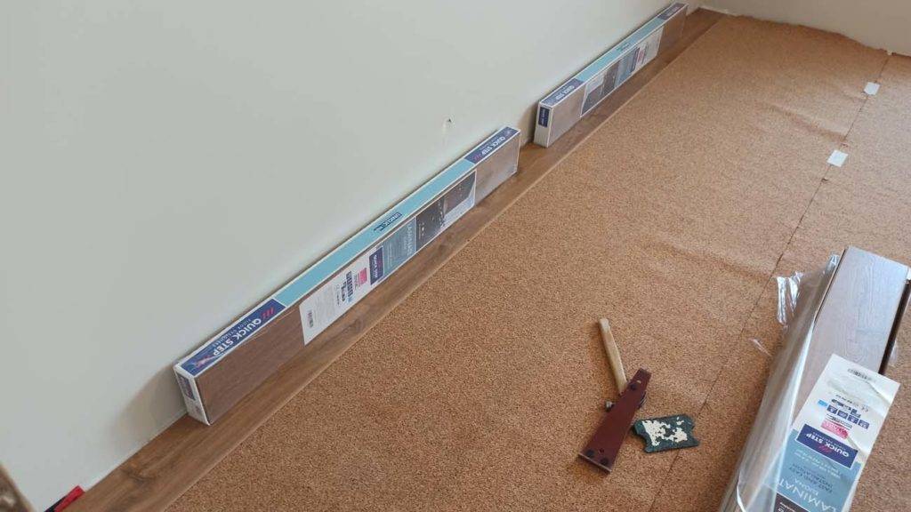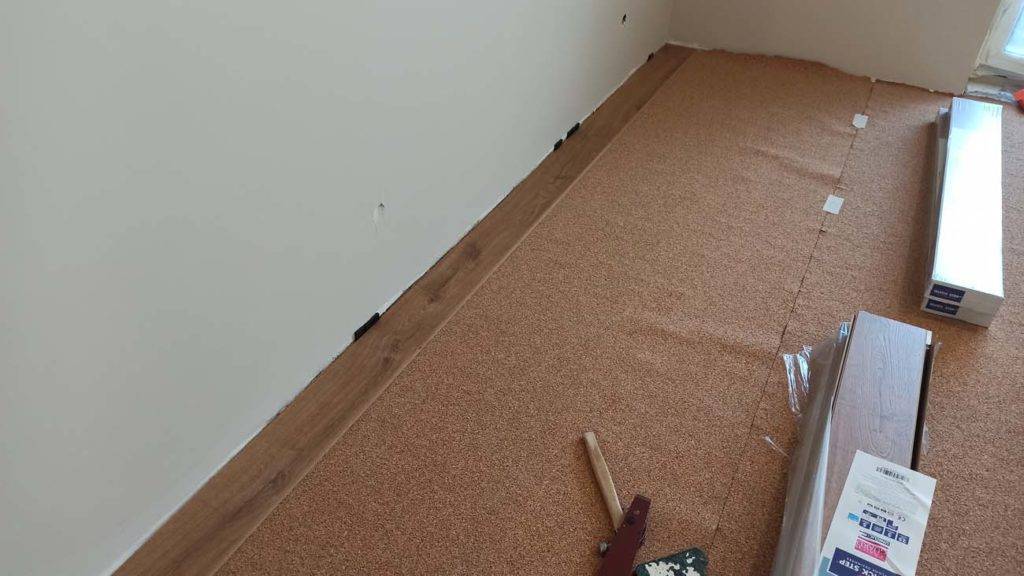 Поэтому были некоторые сомнения, откуда начинать настил. Все же от дальней стены, где должен стоять кухонный гарнитур, начинать монтаж не хотелось.