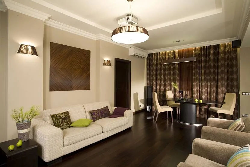 Стена из ламината в зале дополнительно облагораживает это и без того значимое помещение. Вы можете убедиться в этом наглядно ниже.