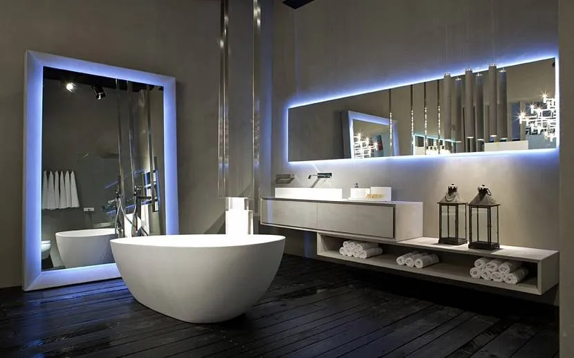 Современный стиль хай-тек создан на основе известного многим минимализма. Классические цвета являются характерными для этого стиля. Черно-белая гамма гармонично смотрится с глянцевыми, хромированными и зеркальными поверхностями. Плитка, уложенная строгими полосами, прекрасно будет сочетаться с концепцией.