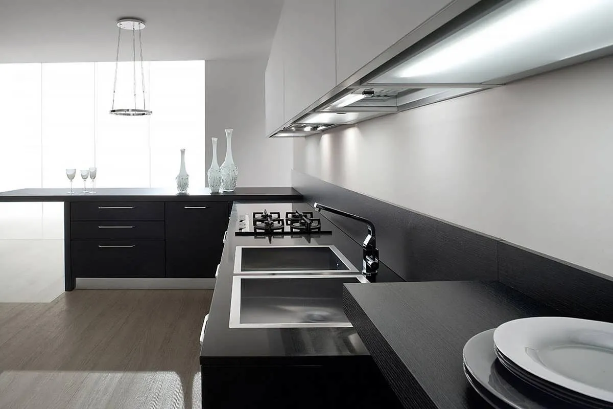 В помещении большой площади можно сделать мебель и стены черного цвета, тогда пол, потолок и столешницы должны быть светлыми. Такой контраст выглядит очень стильно, но требует хорошей освещенности помещения. Лучше, если это естественный свет.