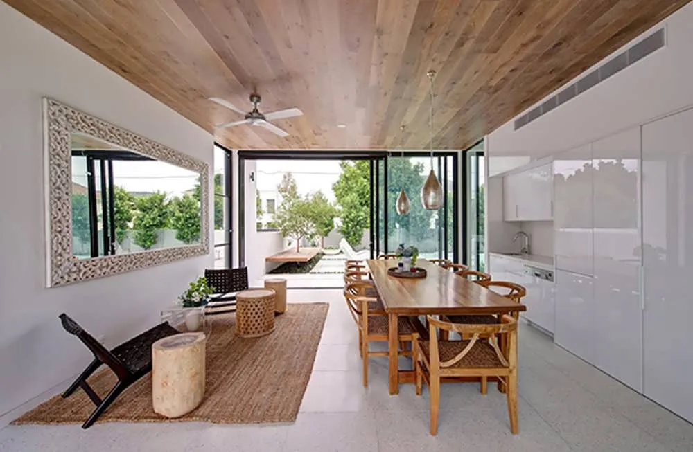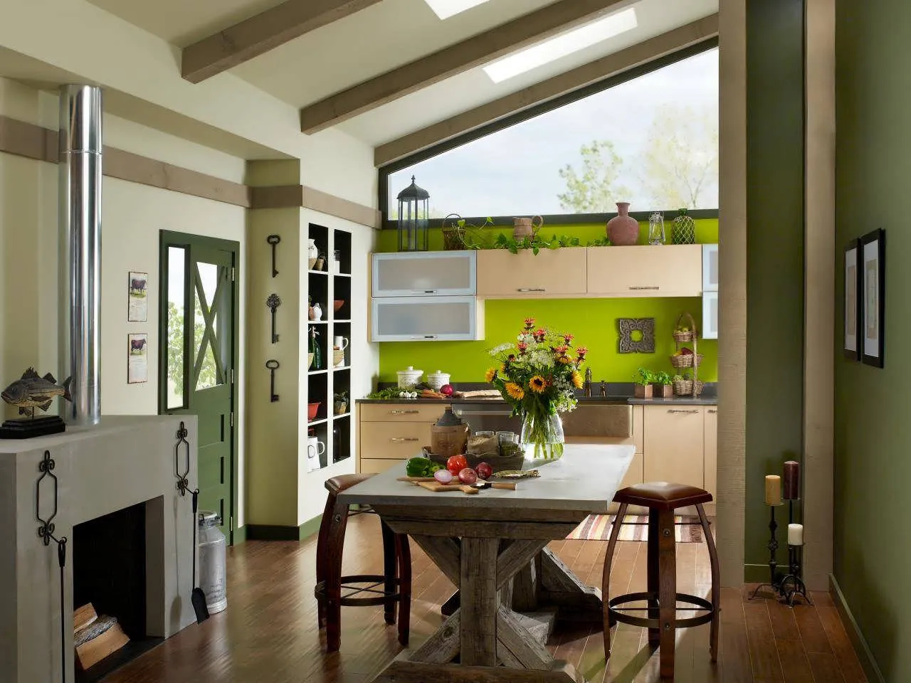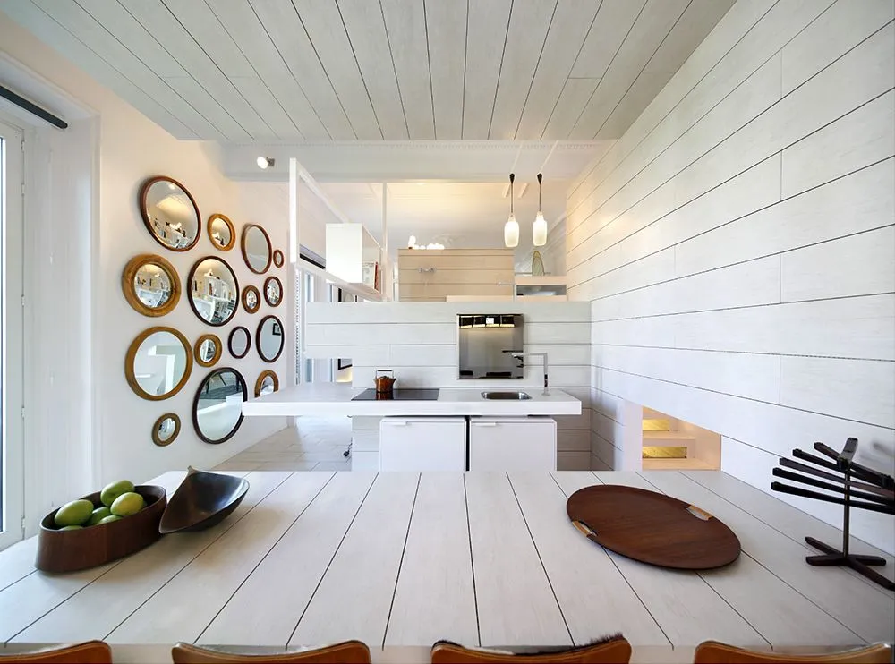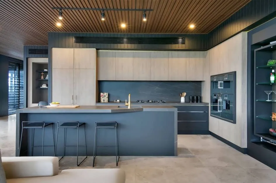 Цветной фартук хорошо сочетается с мебелью нейтральных тонов. В обеденной зоне или зоне отдыха можно сделать составную отделку, используя цветные панели и ламели спокойных оттенков.